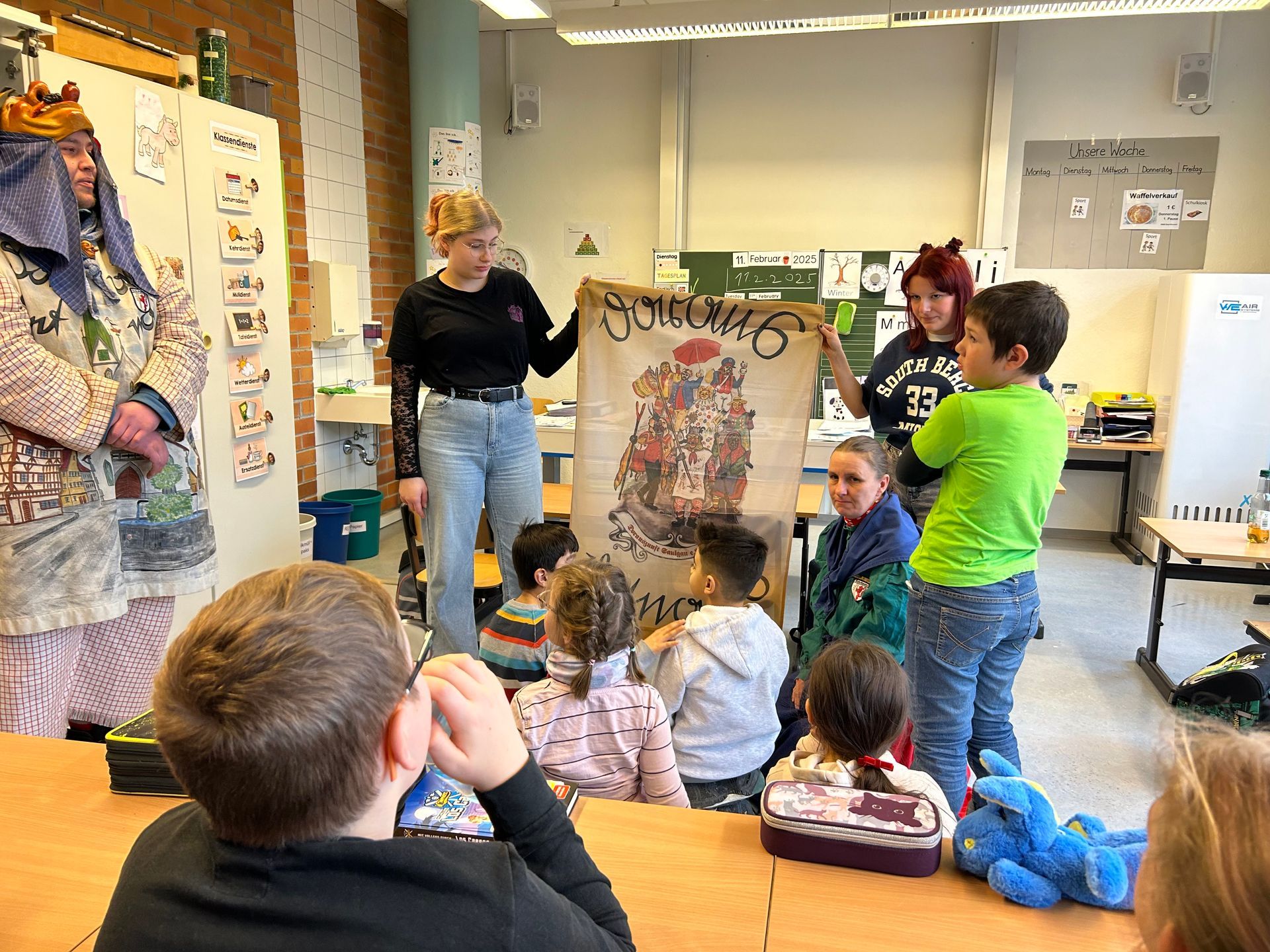 Am Gumpigen Donnerstag hatten wir eine spannende und lustige Schulhausrallye mit verschiedenen Aufgaben und Rätseln. Zur Stärkung gab es im Chiller-Club Würstchen, Gemüseplatten und Getränke. Außerdem haben wir zu lauter Musik getanzt, bis wir von der Narrenzunft Bad Wurzach in die Ferien befreit wurden.