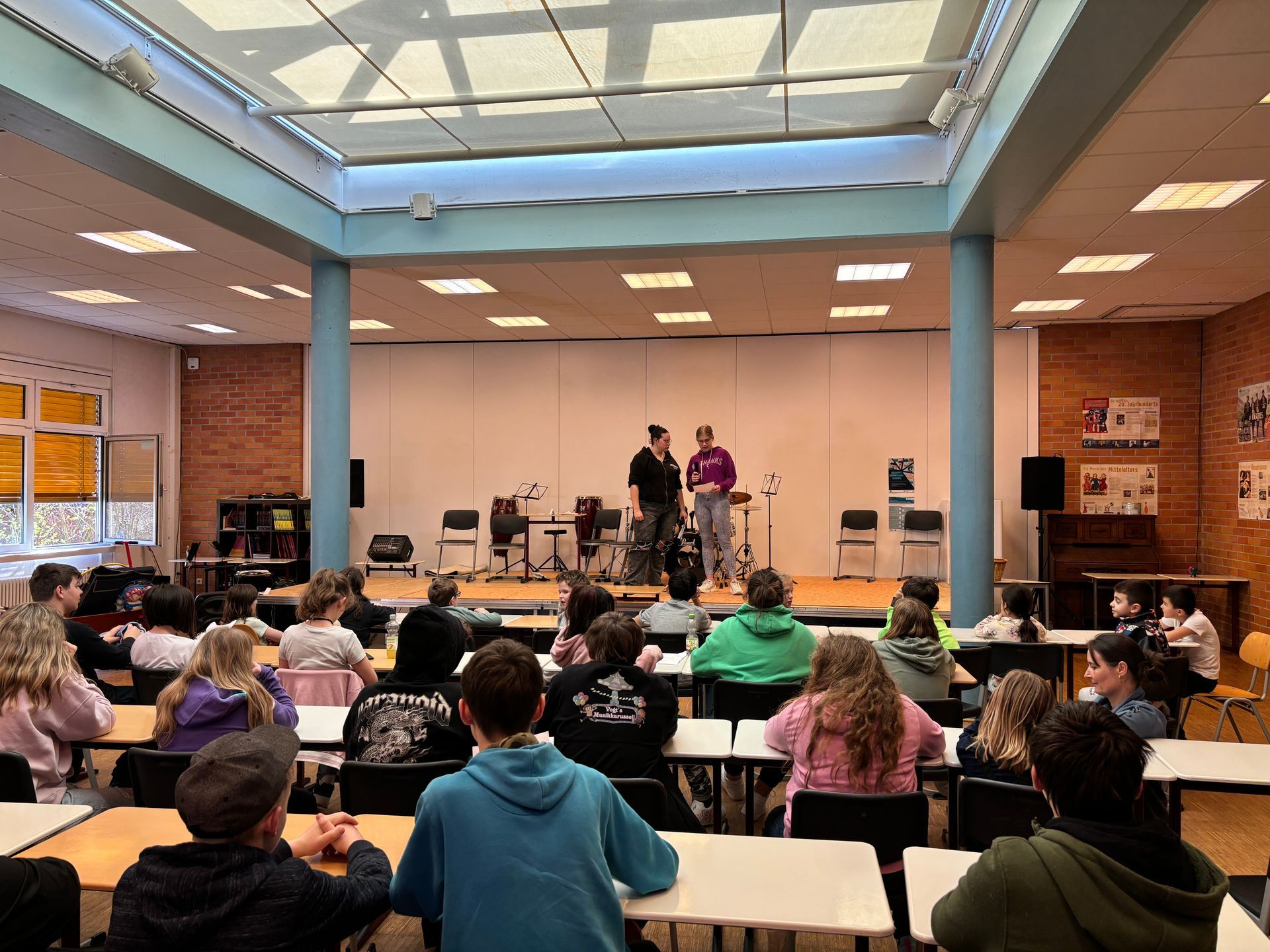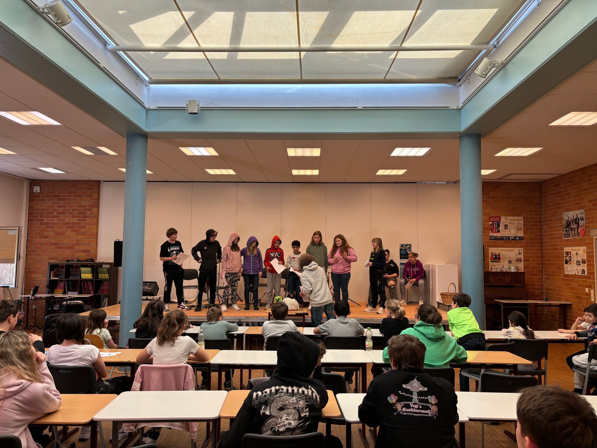 Bei unserer Schulversammlung vor den Osterferien haben alle Klassen tolle Vorführungen gezeigt. Ein Gedicht, die Spielevorstellung von unserem Pausenverleih, ein Rapauftritt, ein Mitmach-Lied und eine Bücherei-Vorstellung wurden gezeigt.
